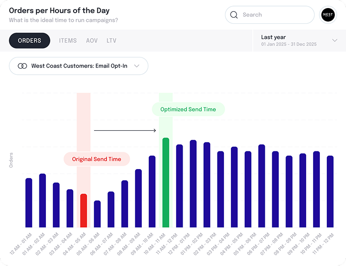 RetentionX revealed that a one-size-fits-all send time was suppressing West Coast performance, not just in engagement, but in realized revenue. Insights showed that a significant share of West Coast demand was arriving outside the brand’s primary send window and was never being fully captured.